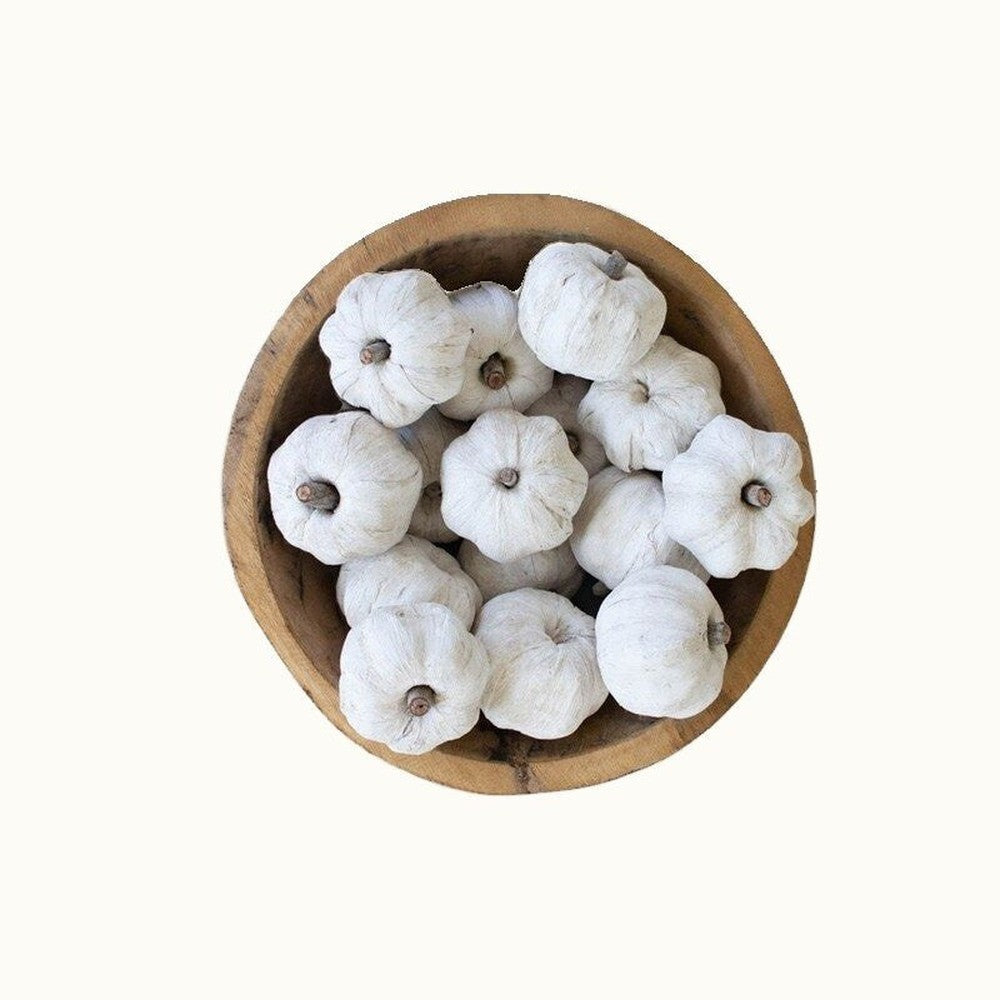 Enhance your autumn decor with this set of 15 white faux mini pumpkins. Ideal for Halloween and harvest-themed arrangements, these neutral pumpkins work perfectly as accents in bowls or vases. Their versatile design also ensures they can be enjoyed throughout the year by pumpkin enthusiasts.